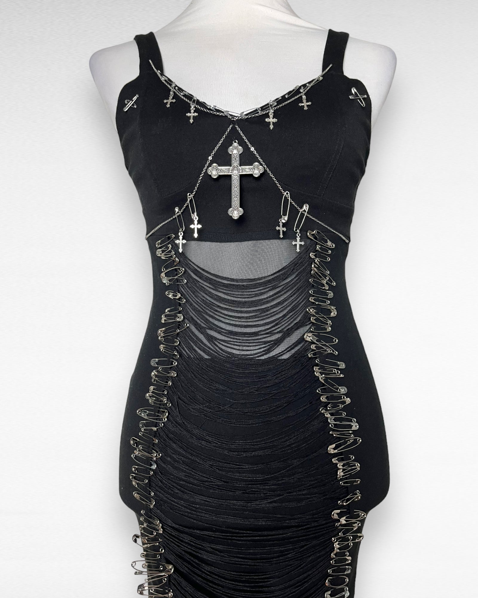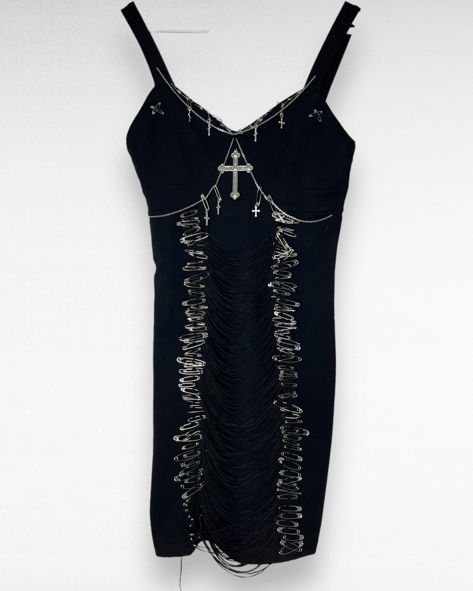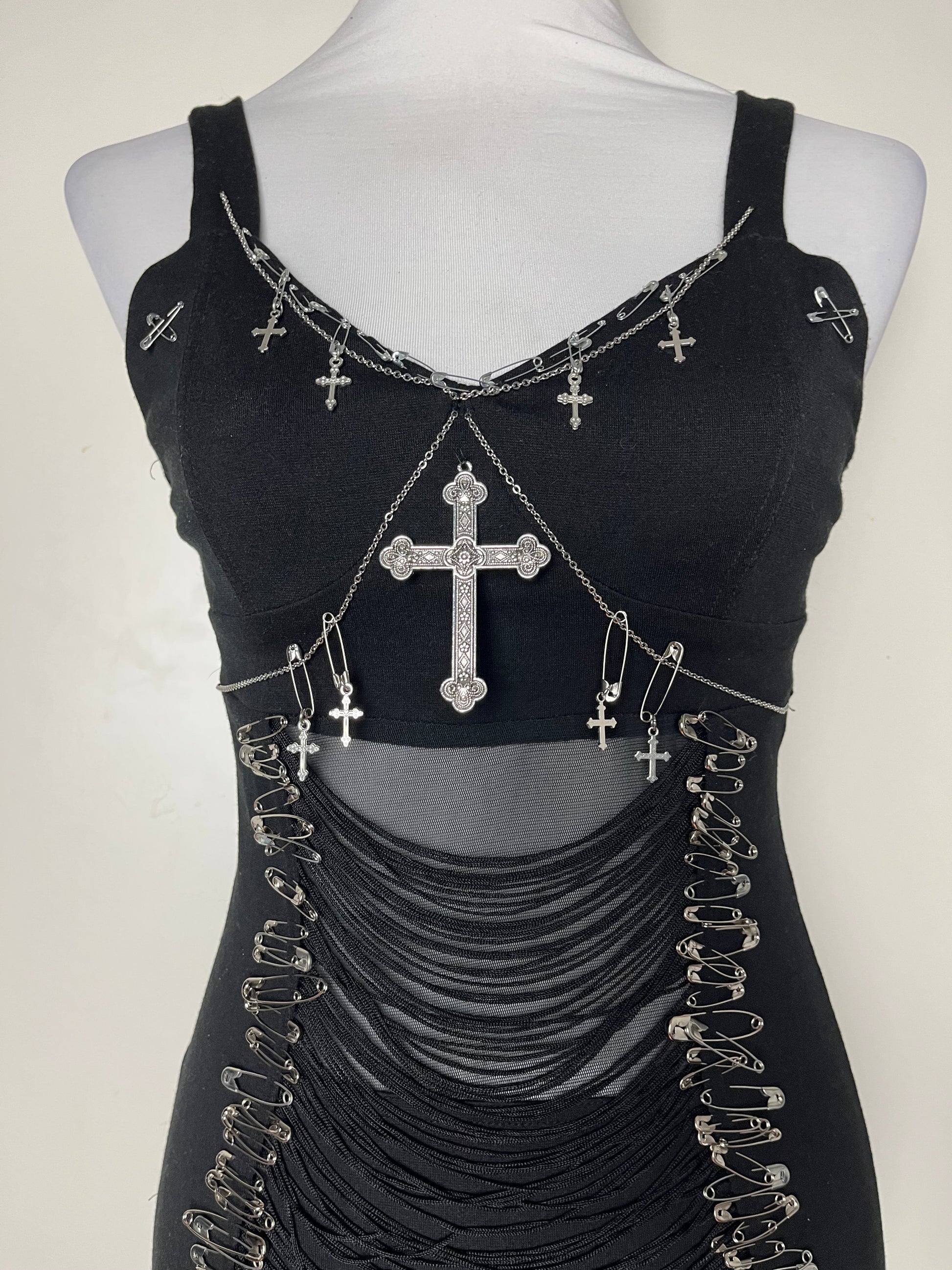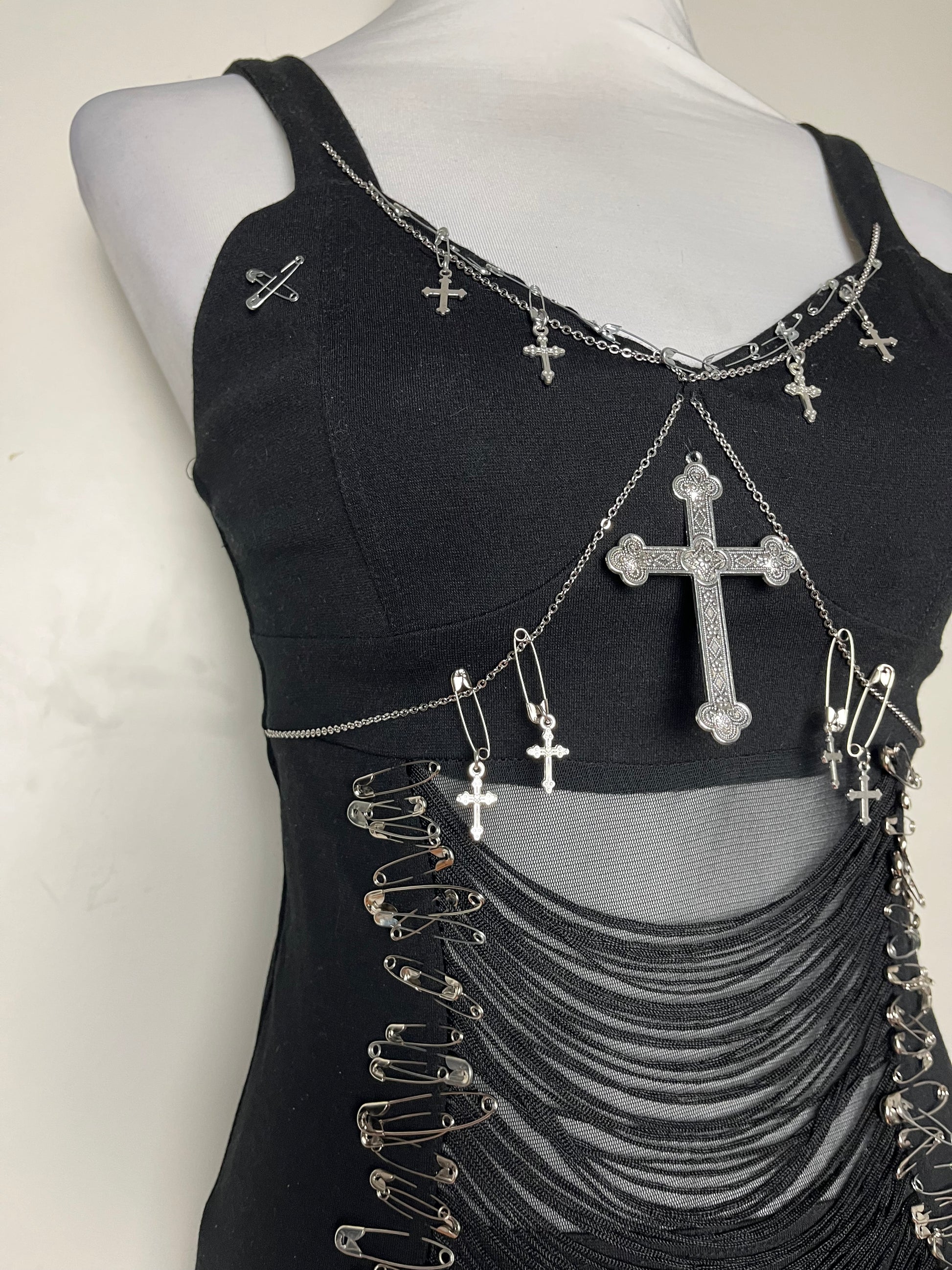 Dress is bought second hand and upcycled with pins, charms and chains.