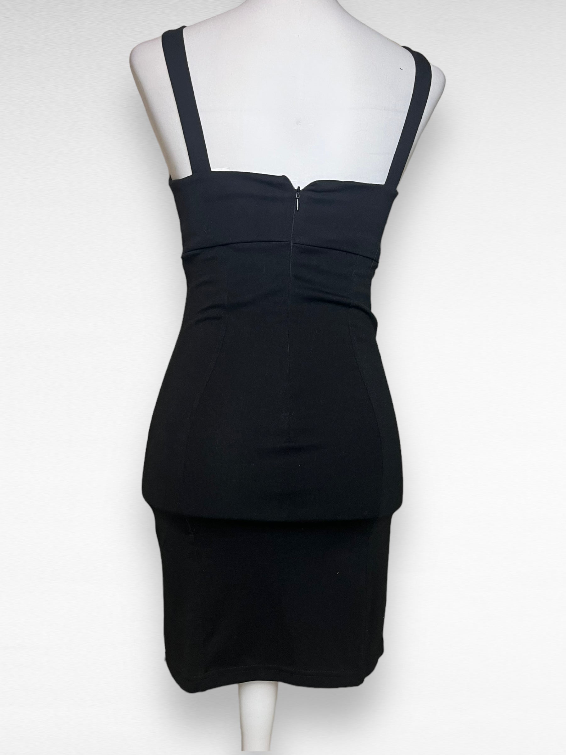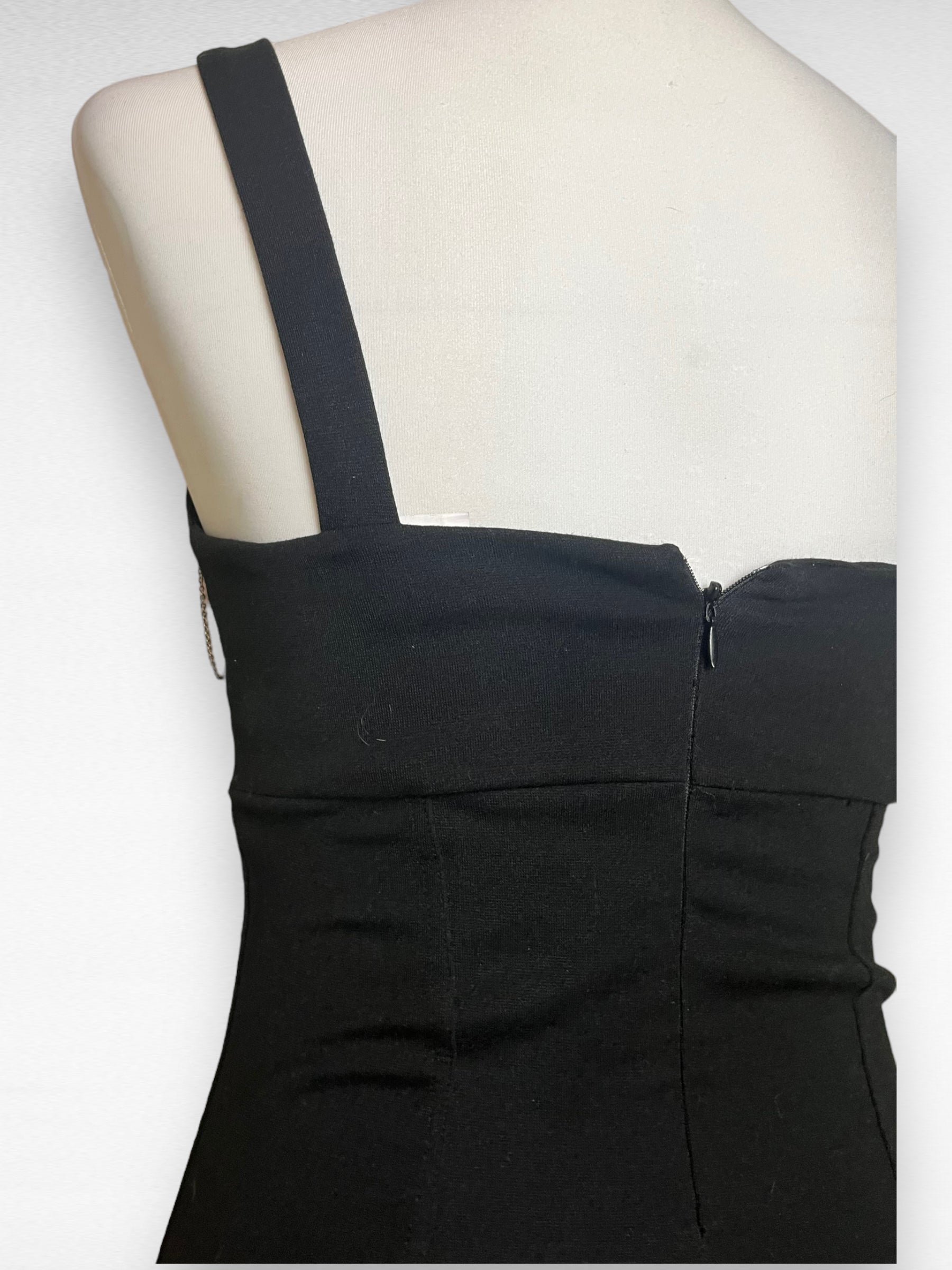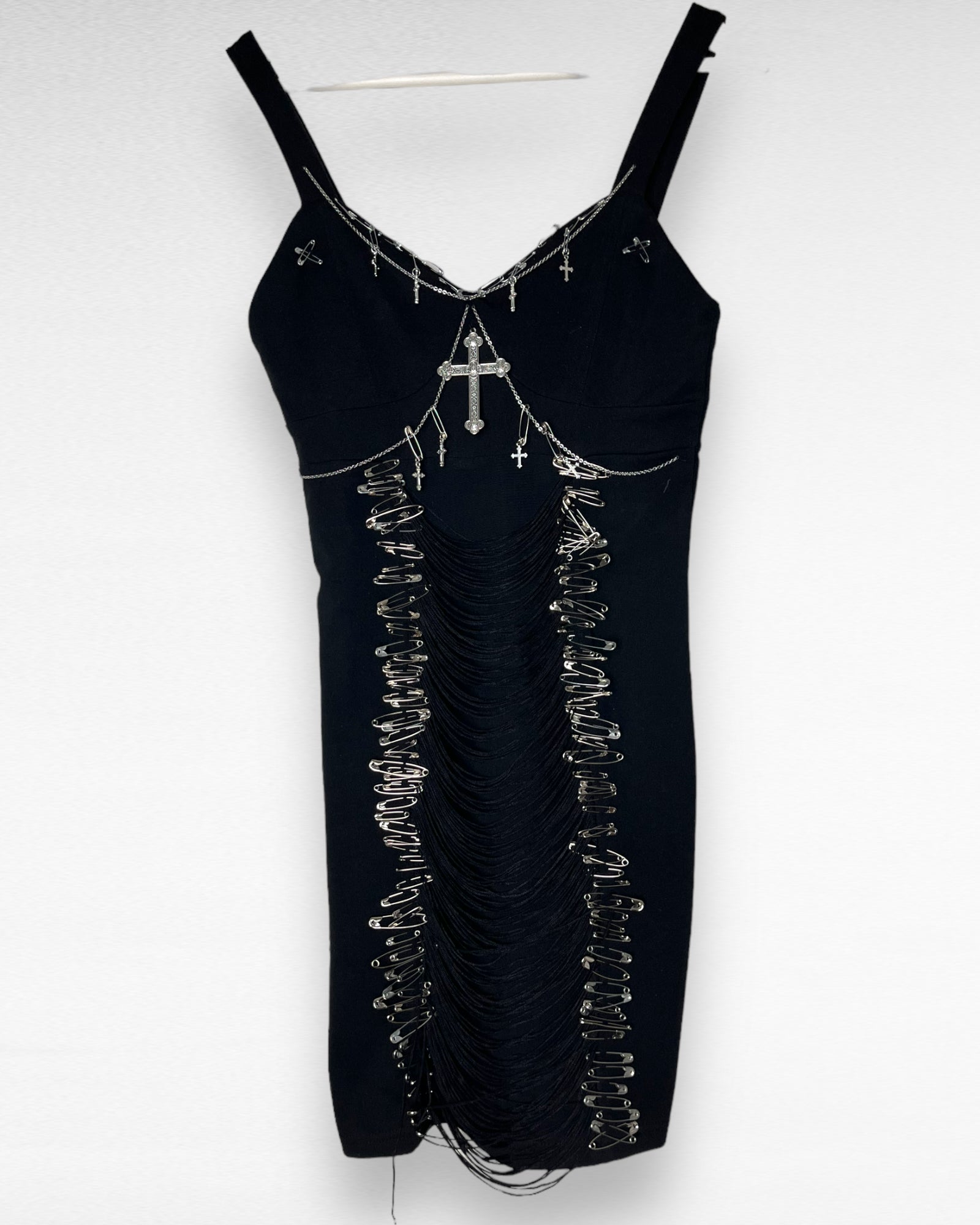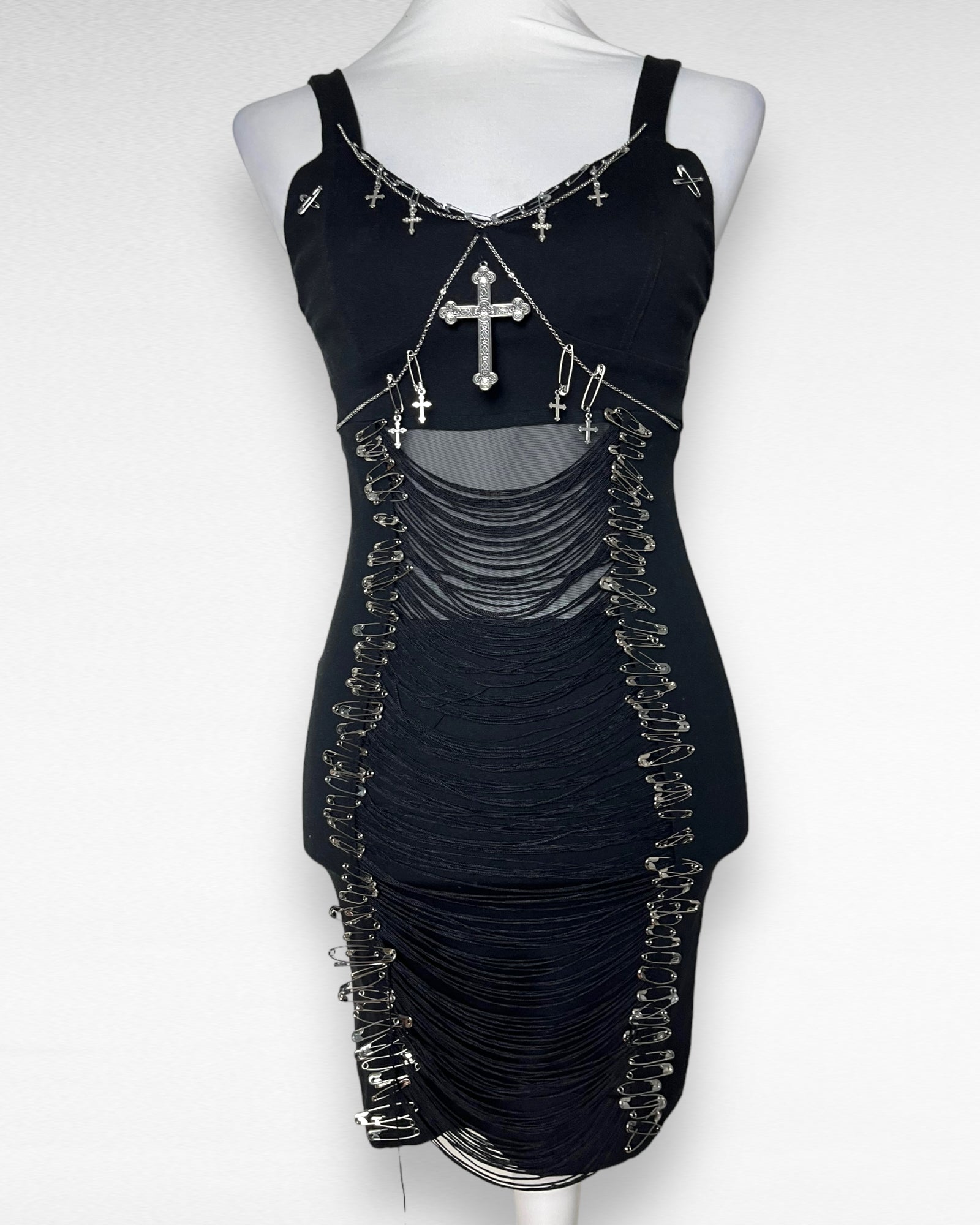 Dress is bought second hand and upcycled with pins, charms and chains.