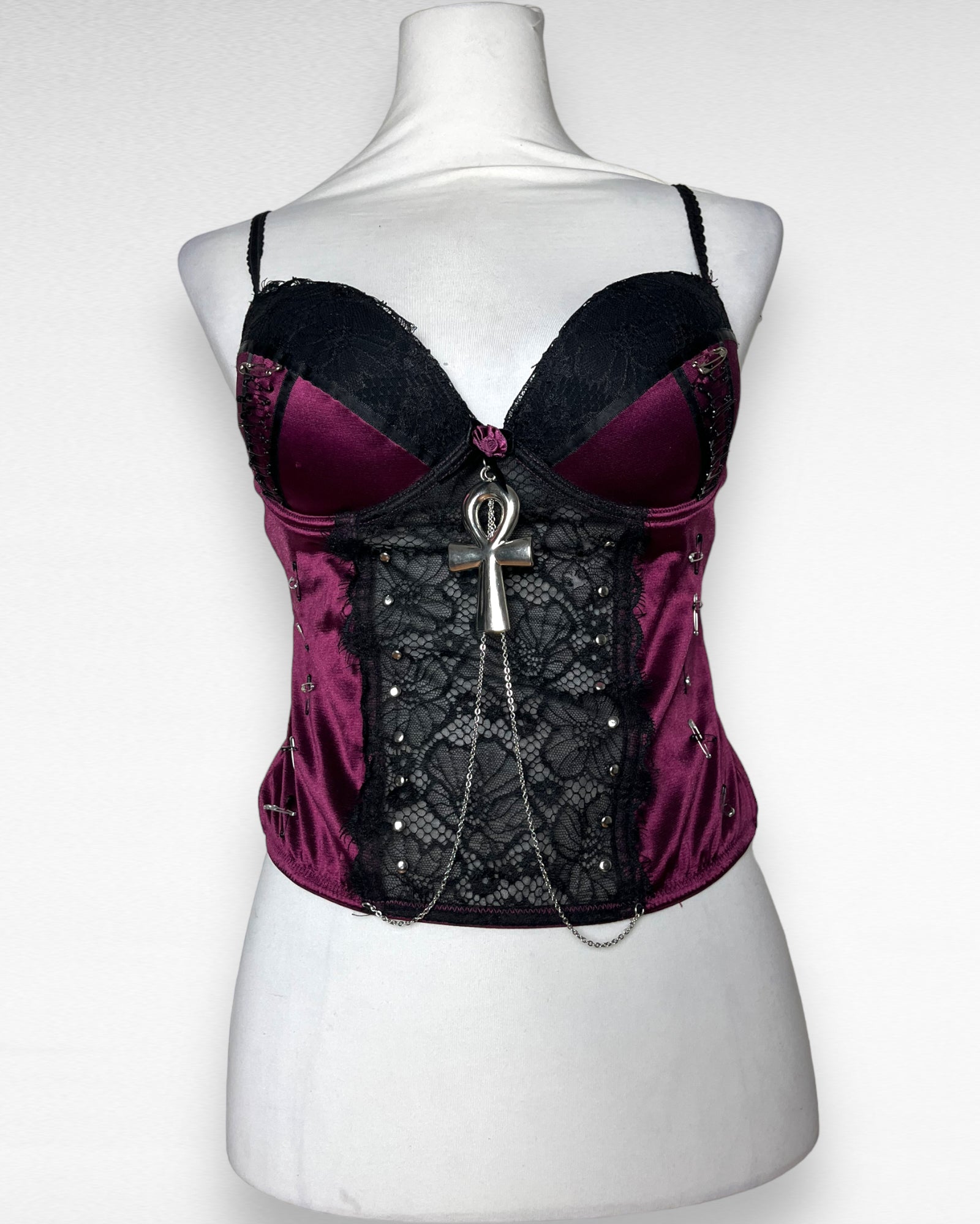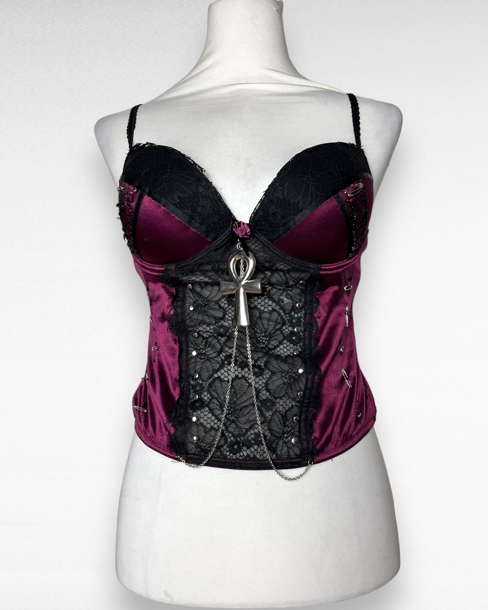 Top is bought second hand and upcycled with pins, charms and chains. Bra is padded
